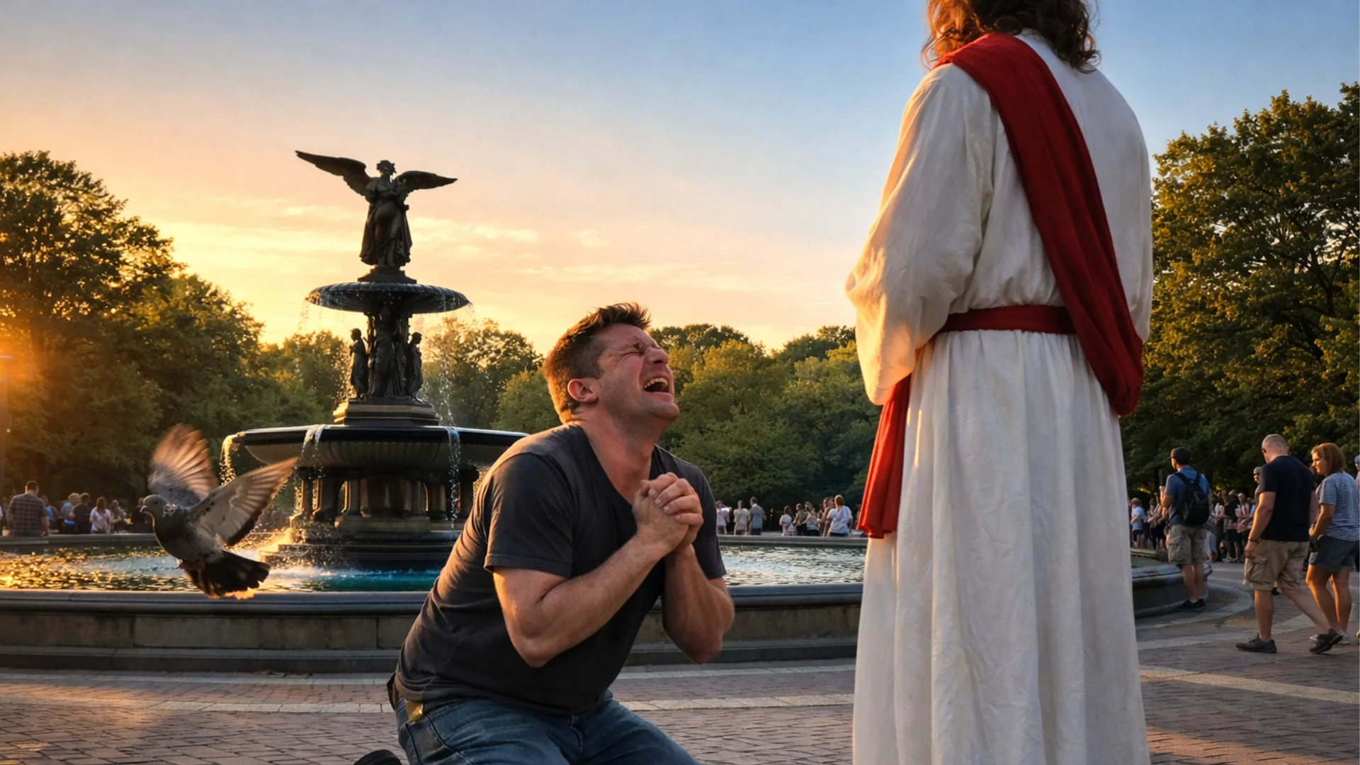 For a second, I thought I was mistaken. Maybe he dropped something. But no. He was kneeling in front of a performer dressed as Jesus. Hands clasped tightly together. Head bowed. Crying. His shoulders were shaking. His lips were moving quickly, desperately. He was praying. Begging. In the middle of Central Park.