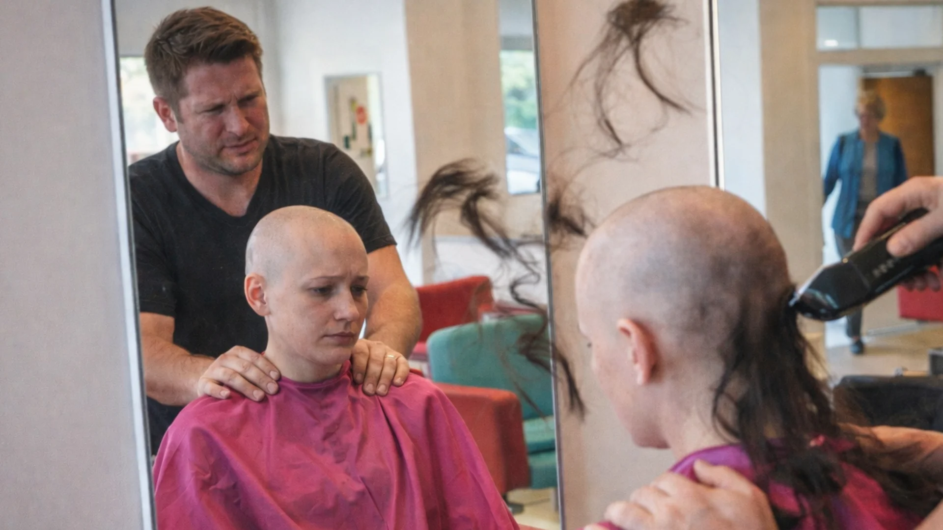She was sitting in the chair. And the stylist was shaving her head. Long hair falling to the floor. Daniel stood behind her, holding her shoulders steady. I walked up to my husband and finally asked for an explanation. Daniel looked like he’d seen a ghost. The woman presented herself: “I’m Miriam,” she said calmly. “I’m his ex.”
