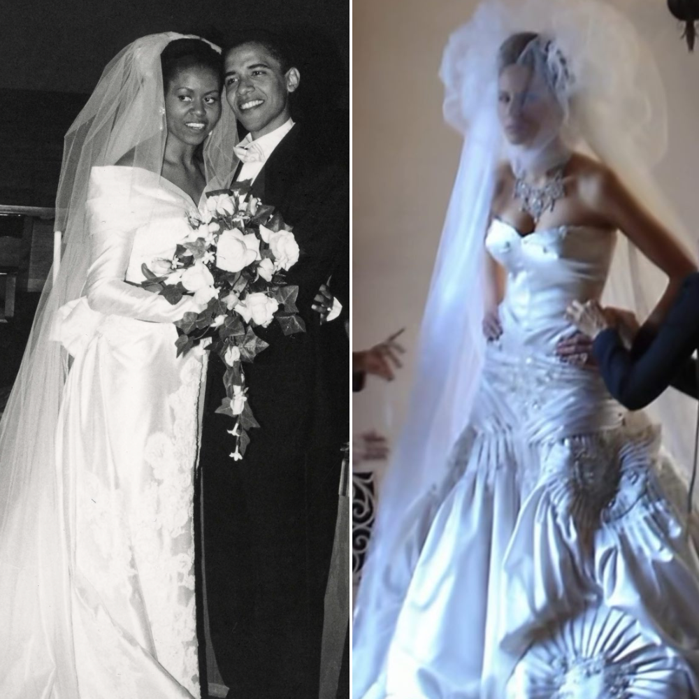 Michelle’s real wedding photo is pure 90s romance — classic sleeves, soft glam, the kind of photo America moms still have framed at home. Melania’s bridal look? That’s not a wedding dress.