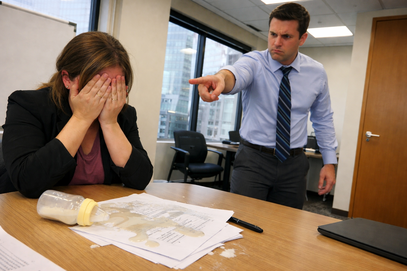 When the room was empty, my boss closed the door behind me and came CLOSER… My boss said I had EMBARASSED the company. He said the investors were questioning our professionalism and the contract might be lost. He said “this industry has standards.” He framed it as a business problem. He framed it as reputation damage. He framed it as my fault. I told him pumping milk at work was legal. I told him HR had approved it. I told him firing me for that would be ILLEGAL. He didn’t argue. He didn’t respond. He opened the door and told me to clear my desk immediately. That was the first crack. Because it was obvious this wasn’t just about the meeting. It was about something older that happened BETWEEN US.