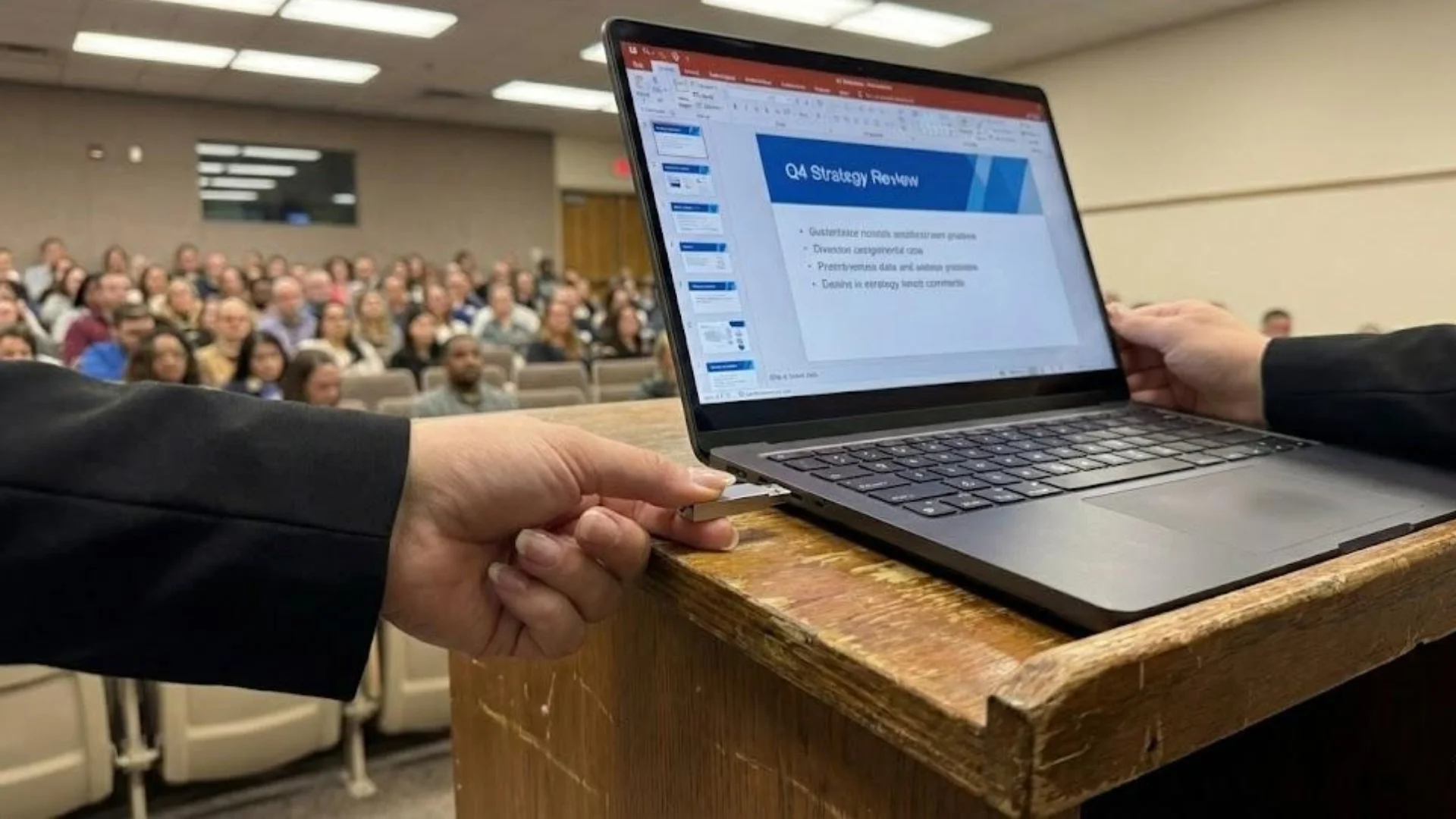 I walk up the stairs to the stage. The CEO frowns. "Lauren? We’re in the middle of a presentation." "I know," I say, plugging my USB drive into the podium's laptop before security can stop me. "I just have one addendum to Chris's report."