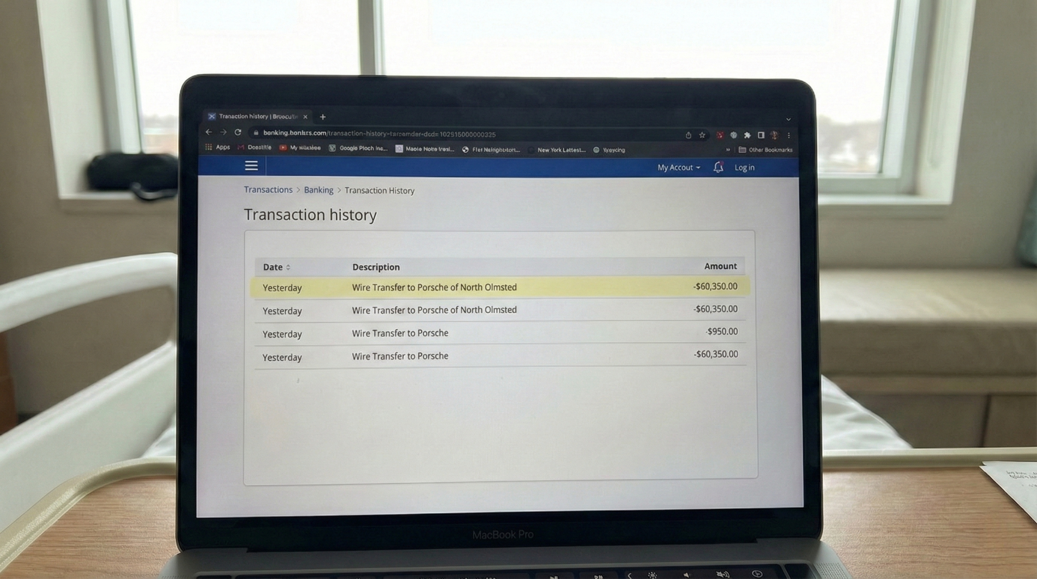 I clicked "Recent Transactions." Yesterday, 2:00 PM: Wire Transfer OUT - $60,000. Recipient: Porsche of North Olmsted.