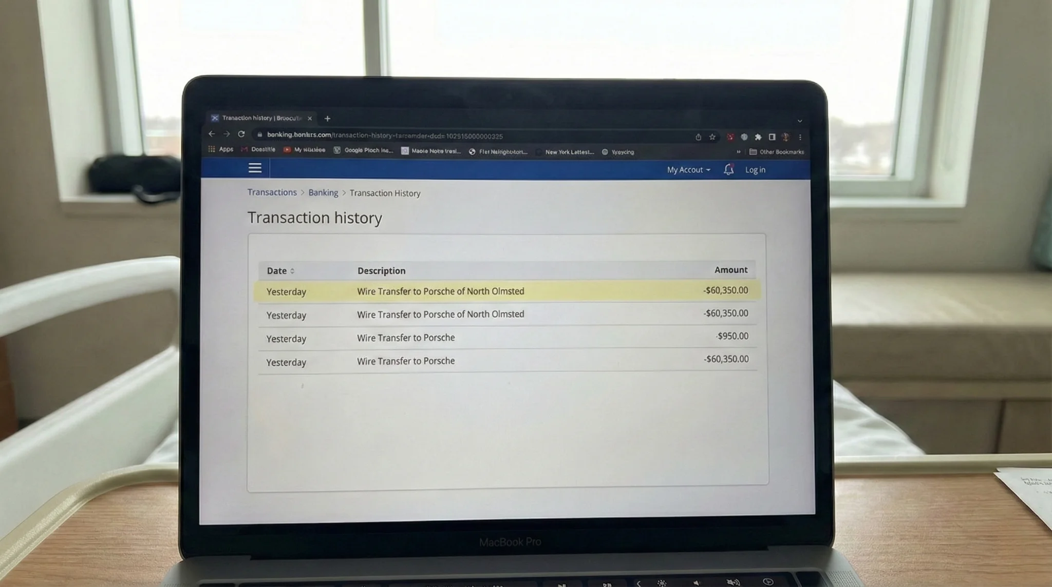 The screen refreshed. The Available Balance was: $14.22. I clicked "Recent Transactions." Yesterday, 2:00 PM: Wire Transfer OUT - $60,000. Recipient: Porsche of North Olmsted.