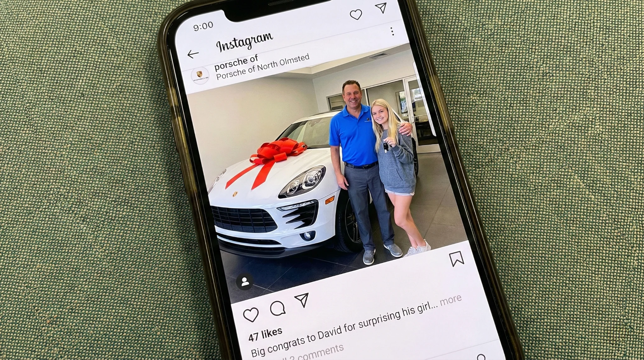David was standing next to a white Macan with a giant red bow, handing the keys to a 24-year-old blonde woman.